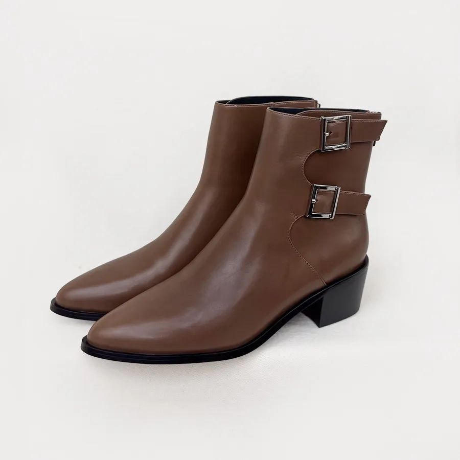研究室的選品・流線輪廓!全真皮雙釦尖頭短靴 咖 全真皮【Major Pleasure】-阿華田棕