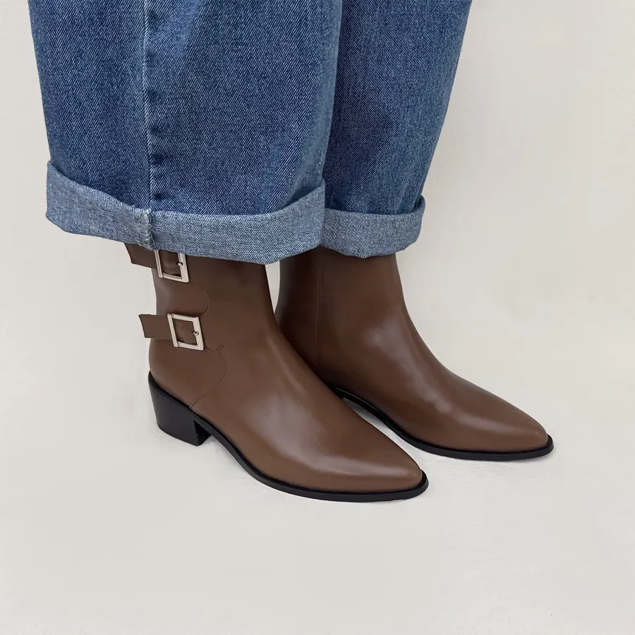 ▸流線輪廓!全真皮雙釦尖頭短靴