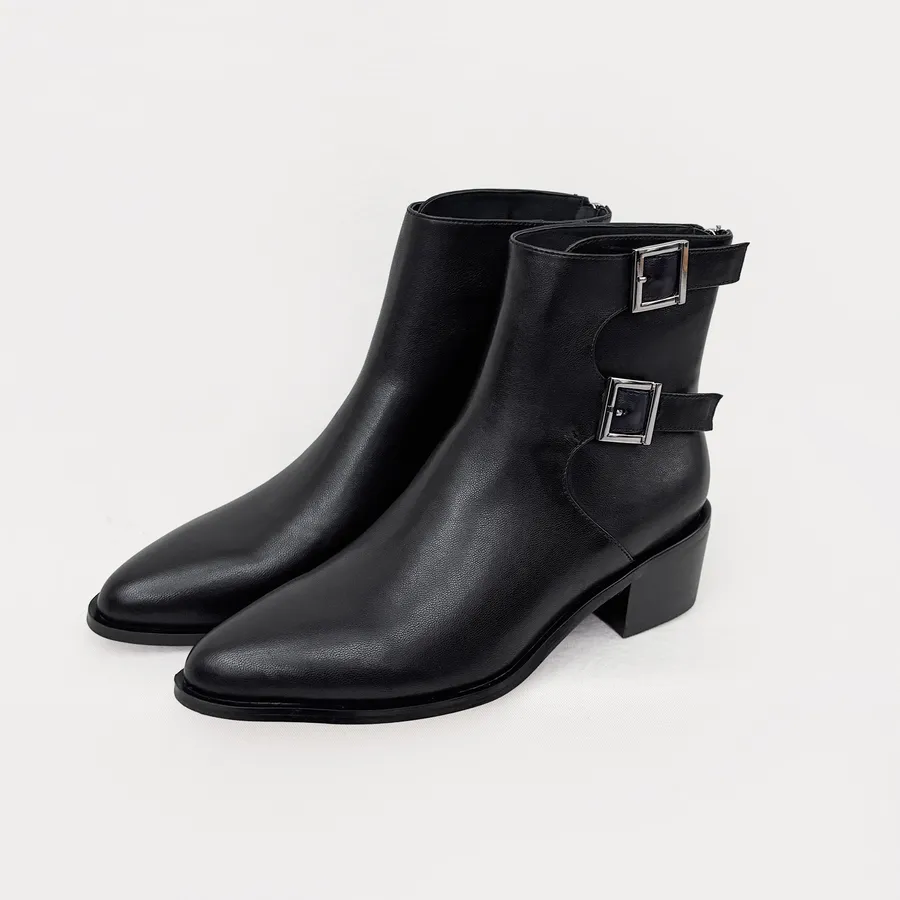 ▸流線輪廓!全真皮雙釦尖頭短靴