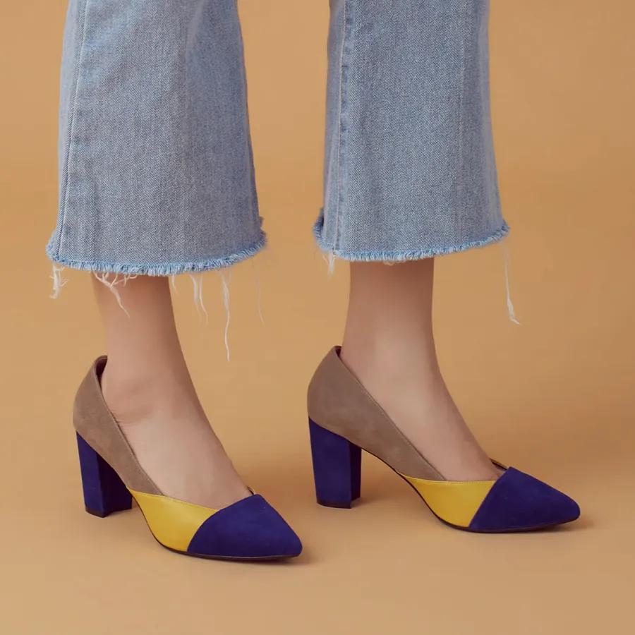 【現貨 22號】彈力低噪鞋跟!色塊軟羊皮粗跟鞋 藍黃棕 高跟鞋 全真皮 MIT 【Major Pleasure】-柏林