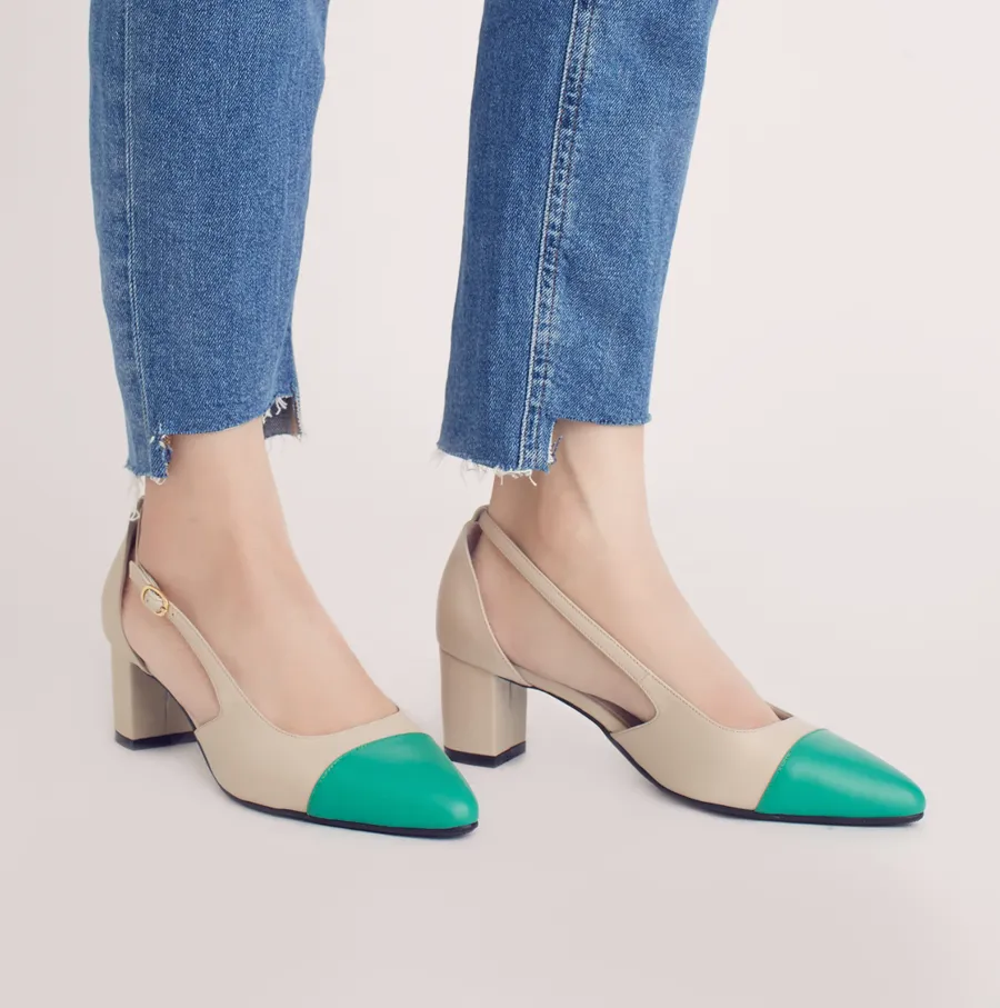 【現貨 21.5 22號】優雅微尖頭!提拉米蘇雙色中跟鞋 綠×米 全真皮 MIT 【Major Pleasure】-涼薄荷