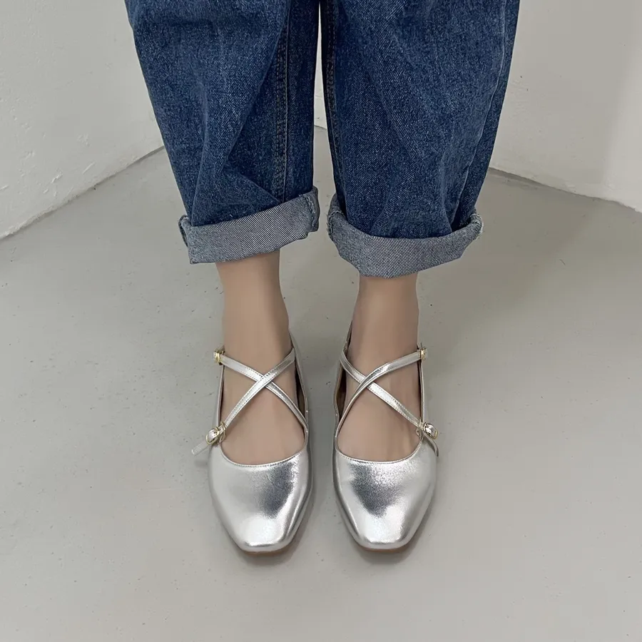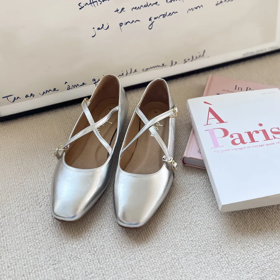 交叉繫帶!花之圓舞曲瑪莉珍鞋 銀 全真皮【Major Pleasure】-羊皮銀
