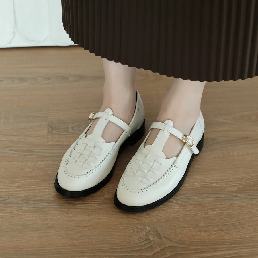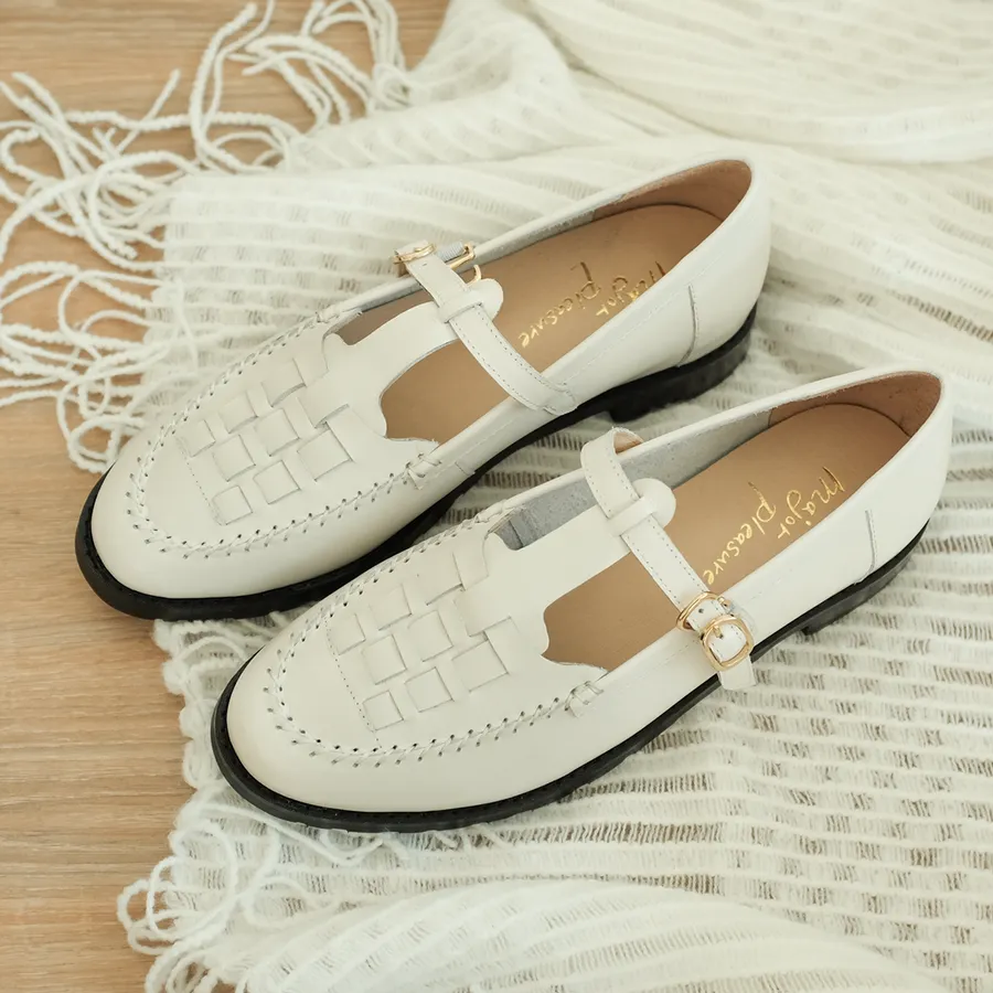 花與愛麗絲!編織繫帶瑪莉珍鞋 白 全真皮 MIT【Major Pleasure】-白梔子