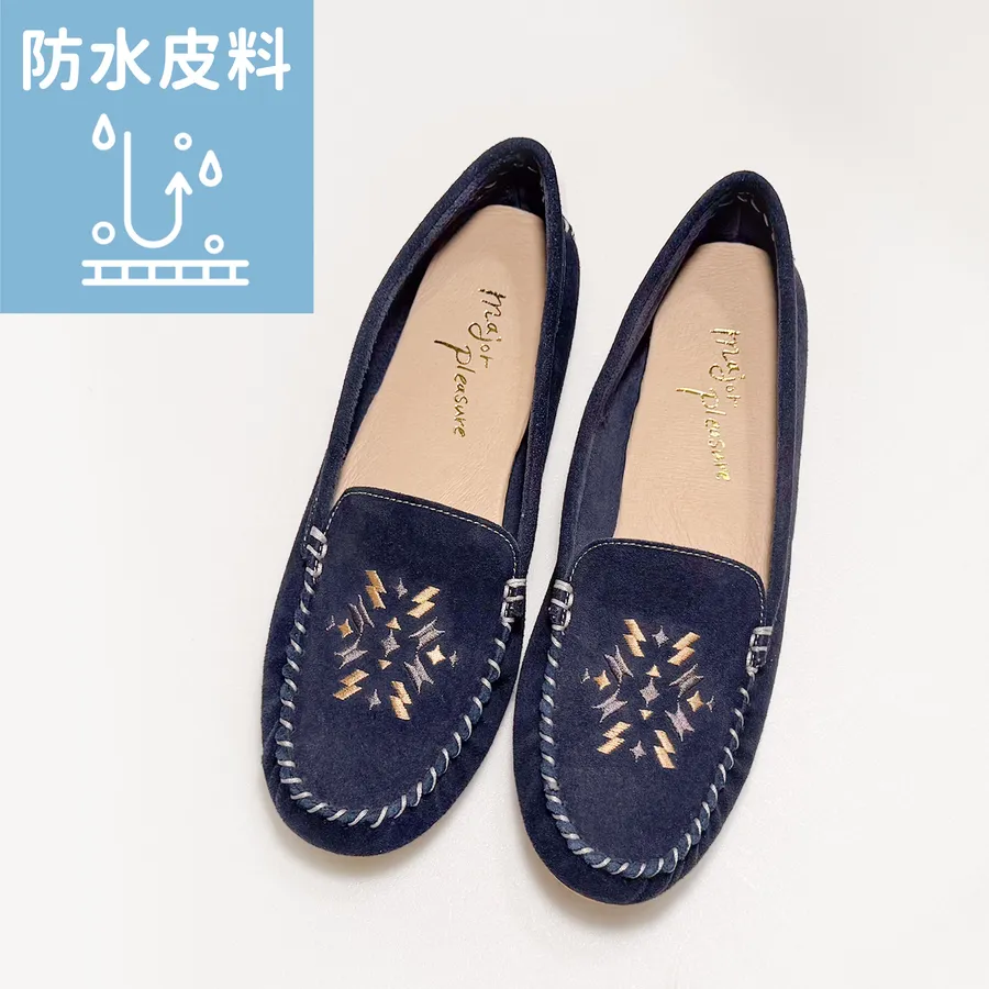 防水皮革!閃電星芒刺繡圖騰手工莫卡辛 藍 全真皮 MIT【Major Pleasure】-午夜琥珀